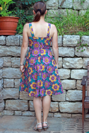 Ich habe Größe 10 zugeschnitten. Man muss bei diesem Schnitt aber echt aufpassen. Die beiden Oberteile fallen unterschiedlich aus. Das andere Oberteil in Größe 10 wäre mir viel zu groß. Da brauche ich etwas zwischen Größe 6 und 8. Gekürzt habe ich auch auf Petit-Größe, war aber etwas zu viel des Guten. Beim nächsten Mal wird das Oberteil einen Tick länger. Nähen lies sich das Kleid sehr gut. Teile passen alle super zusammen und das Oberteil passt echt gut an der Brust. Hat mich wirklich überrascht, da ich hier meist noch Platz im Kleid über habe. Ändern musste ich daher nichts. Echt jetzt; gar nix geändert. Nur halt ein paar Träger dazu gebastelt und statt Futter gab es nur Belege. Ist ja Sommer und sau warm. Da brauche ich keine gefütterten Kleider und der Waxprint ist auch blickdicht. Juhu!
